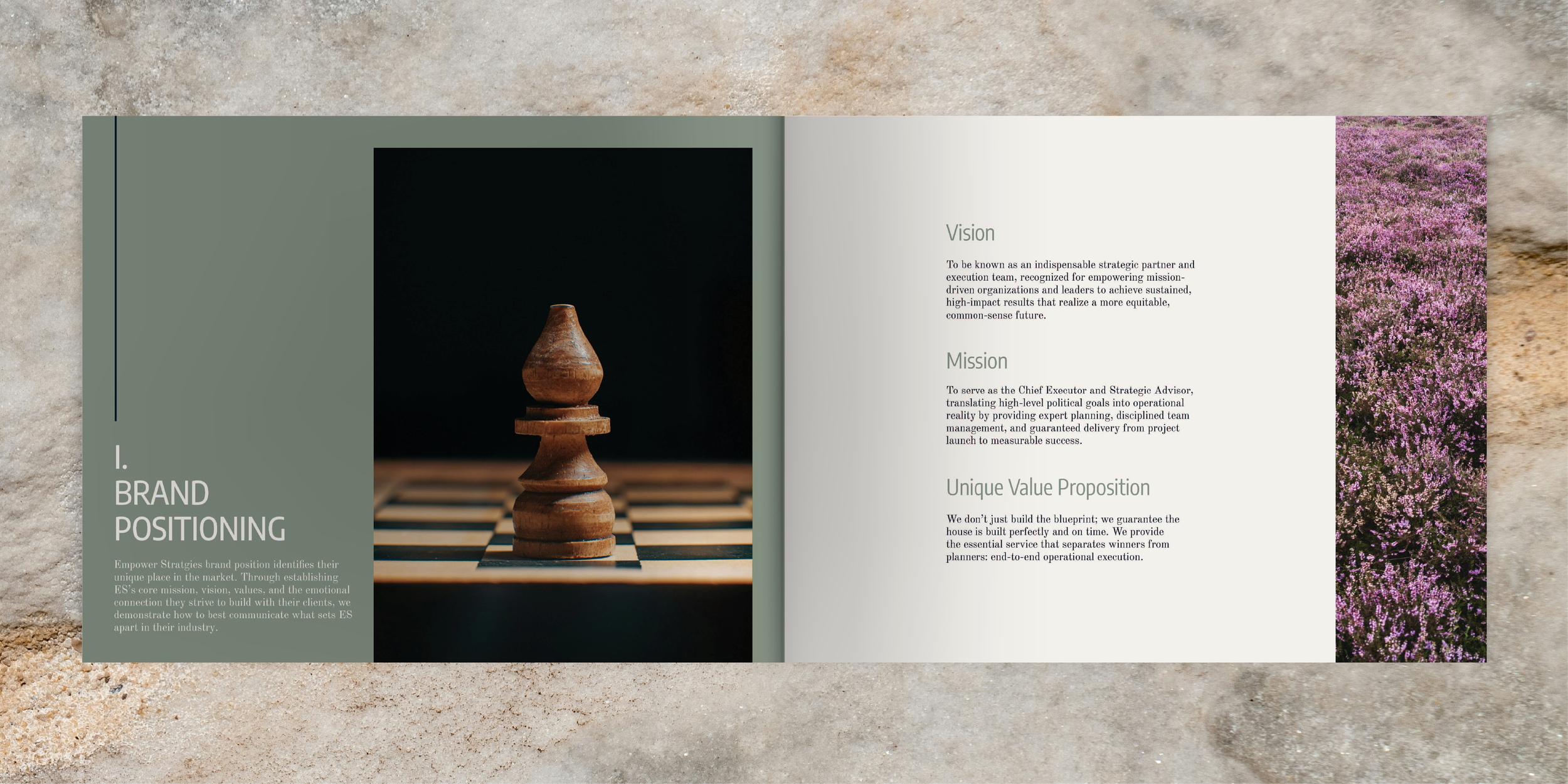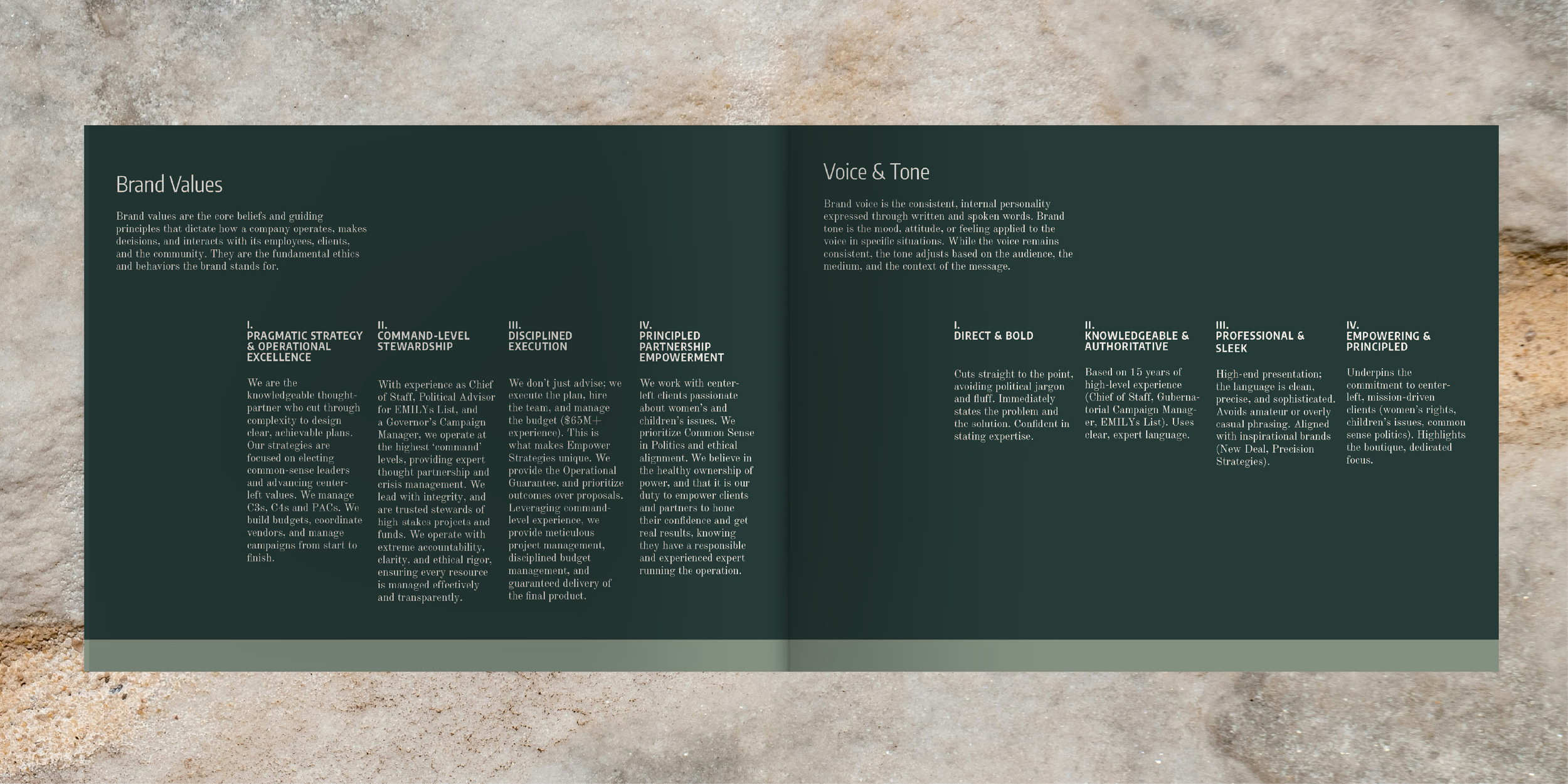 Empower Strategies was positioned as the boutique firm that closes the gap between vision and victory — not a consultant that hands over a deck and walks away, but the Chief Executor who stays in the trenches. Built around four core values (Pragmatic Strategy & Operational Excellence, Command-Level Stewardship, Disciplined Execution, and Principled Partnership & Empowerment), the brand speaks directly to two audiences: campaign managers and PAC directors who have a strategy but need someone to own the execution, and major donors who need absolute confidence that every dollar is stewarded with ethical rigor. The brand voice reflects this: Direct & Bold, Knowledgeable & Authoritative, and Professional & Sleek — never jargon-heavy, always expert.